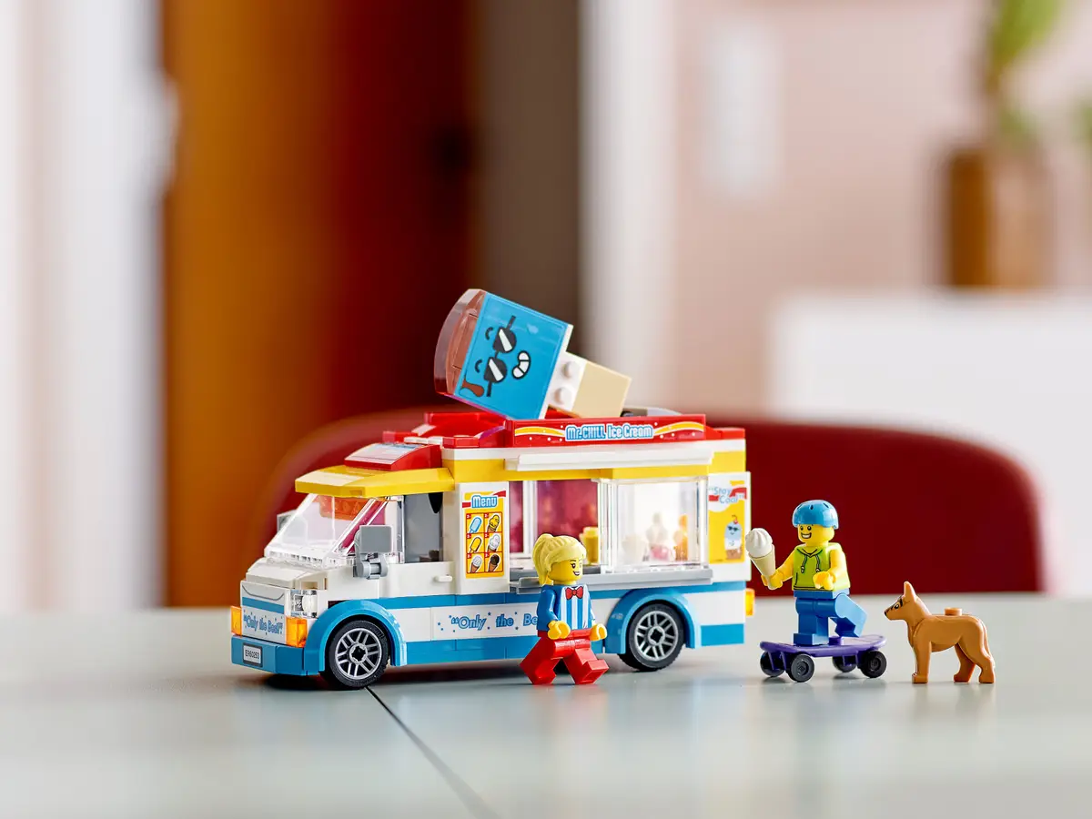 Dzieci mogą serwować mieszkańcom LEGO® City lody w rożkach i na patykach z okienka odlotowej furgonetki z lodami. Klocki kompatybilne z innymi zestawami: Tak. Zabawka posiada certyfikaty: CE
