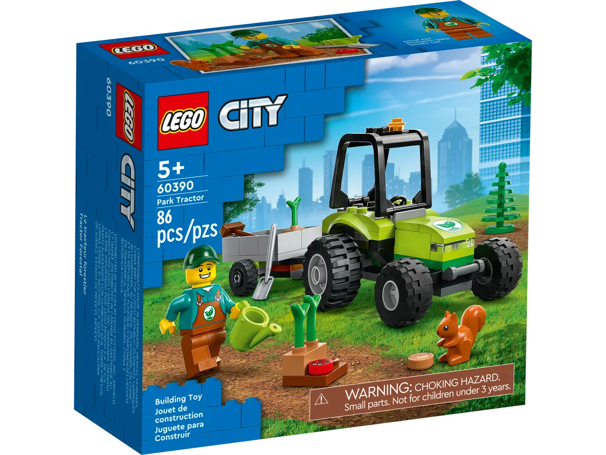 LEGO City, Pojazdy. Model 60390 składa się z 86 elementów. Liczba figurek w zestawie: 1. Dzieci mogą wybrać się na misję sadzenia drzew dzięki zestawowi LEGO® City Traktor w parku (60390) z traktorem, przyczepą, drzewem, sadzonkami i narzędziami. Dodatkowo znajduje się w nim minifigurka ogrodnika i figurki biedronki oraz wiewiórki. . Klocki kompatybilne z innymi zestawami: Tak. Zabawka posiada certyfikaty: CE