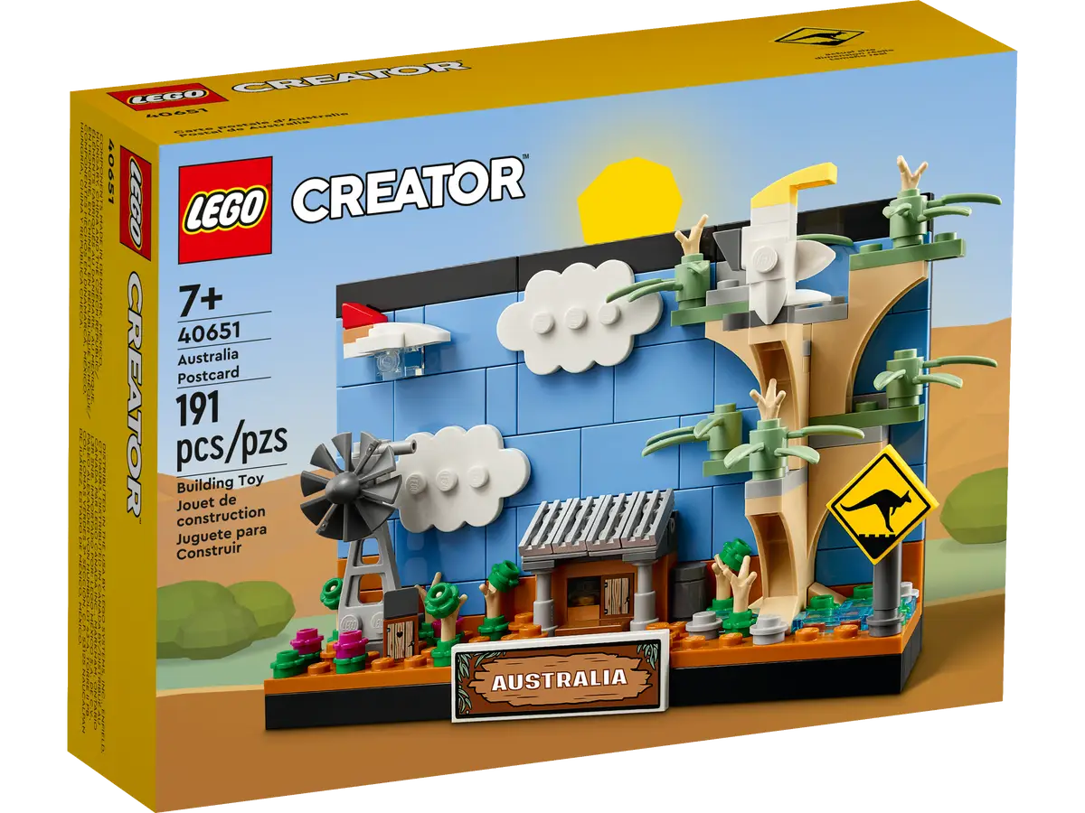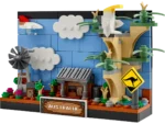 Ożyw wyjątkowe atrakcje turystyczne Australii dzięki imponującemu zestawowi 3D Pocztówka z Australii (40651). Ten wspaniały model obejmuje charakterystyczne symbole australijskiego krajobrazu, w tym szopę, wiatrak, eukaliptus, kwiaty pustyni i kakadu. Fani LEGO® mogą też dodać dekoracyjną plakietkę z napisem „Australia” oraz znak drogowy ostrzegający przed kangurami.